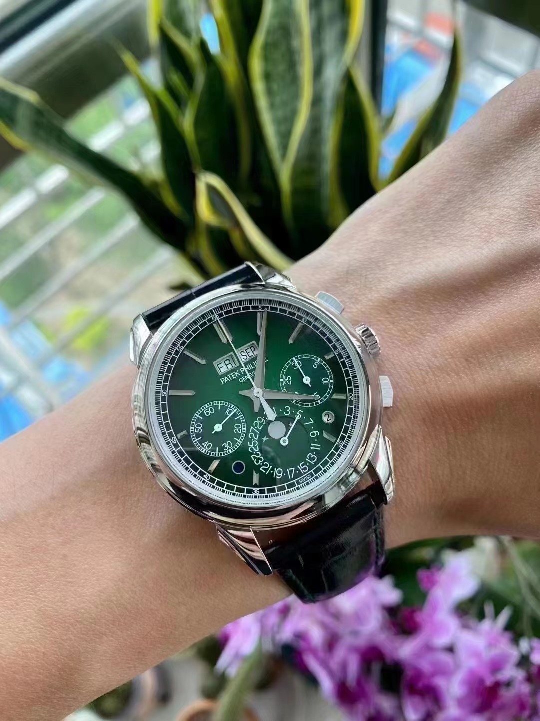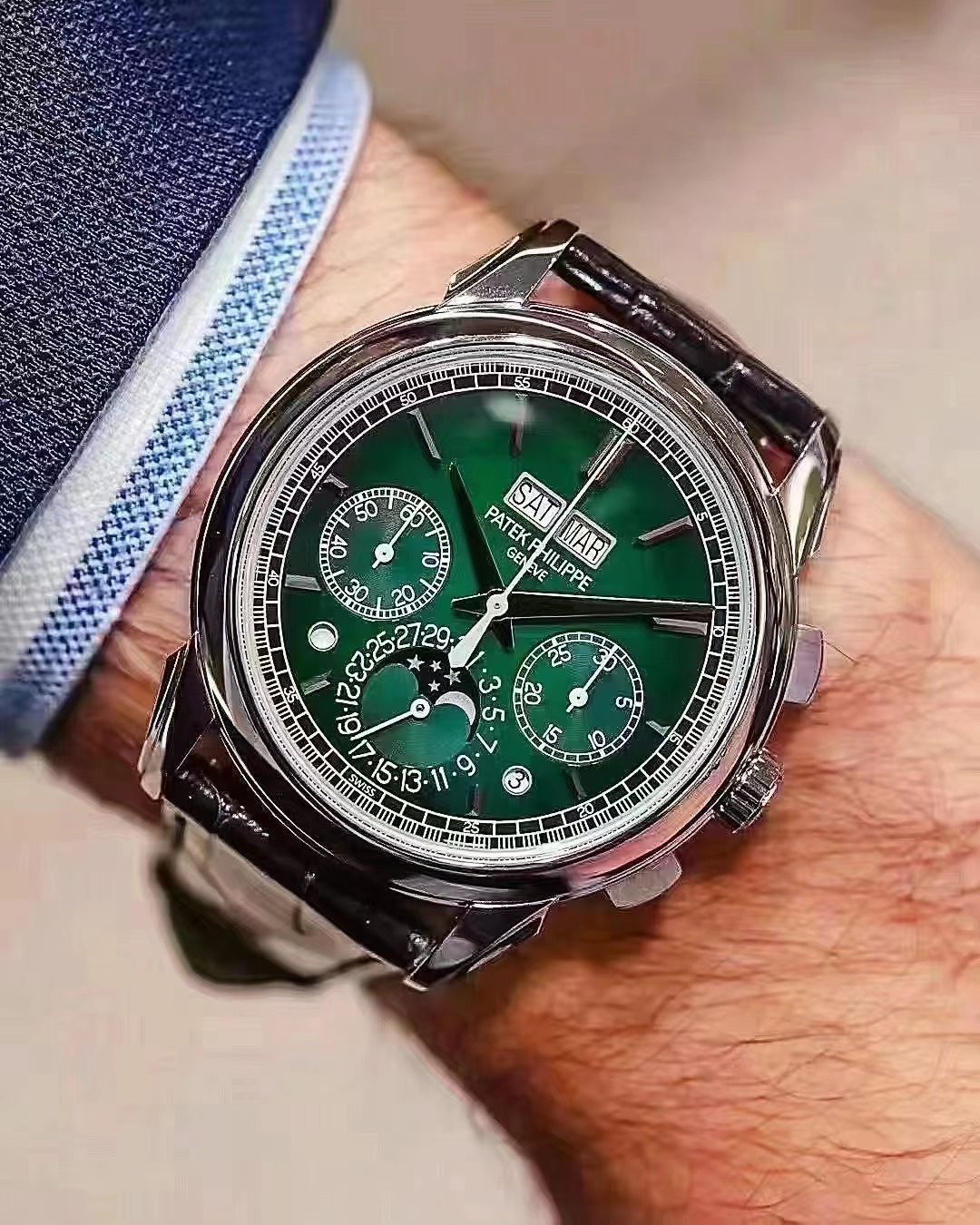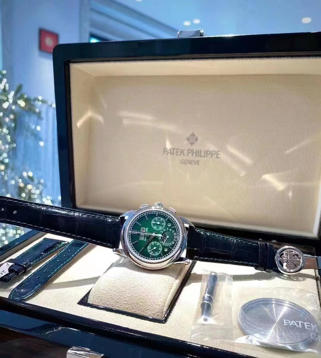 表盘材质:绿漆表盘,黑色渐变效果,金质立体时标,白金琢面剑形指针,白金琢面剑形指针