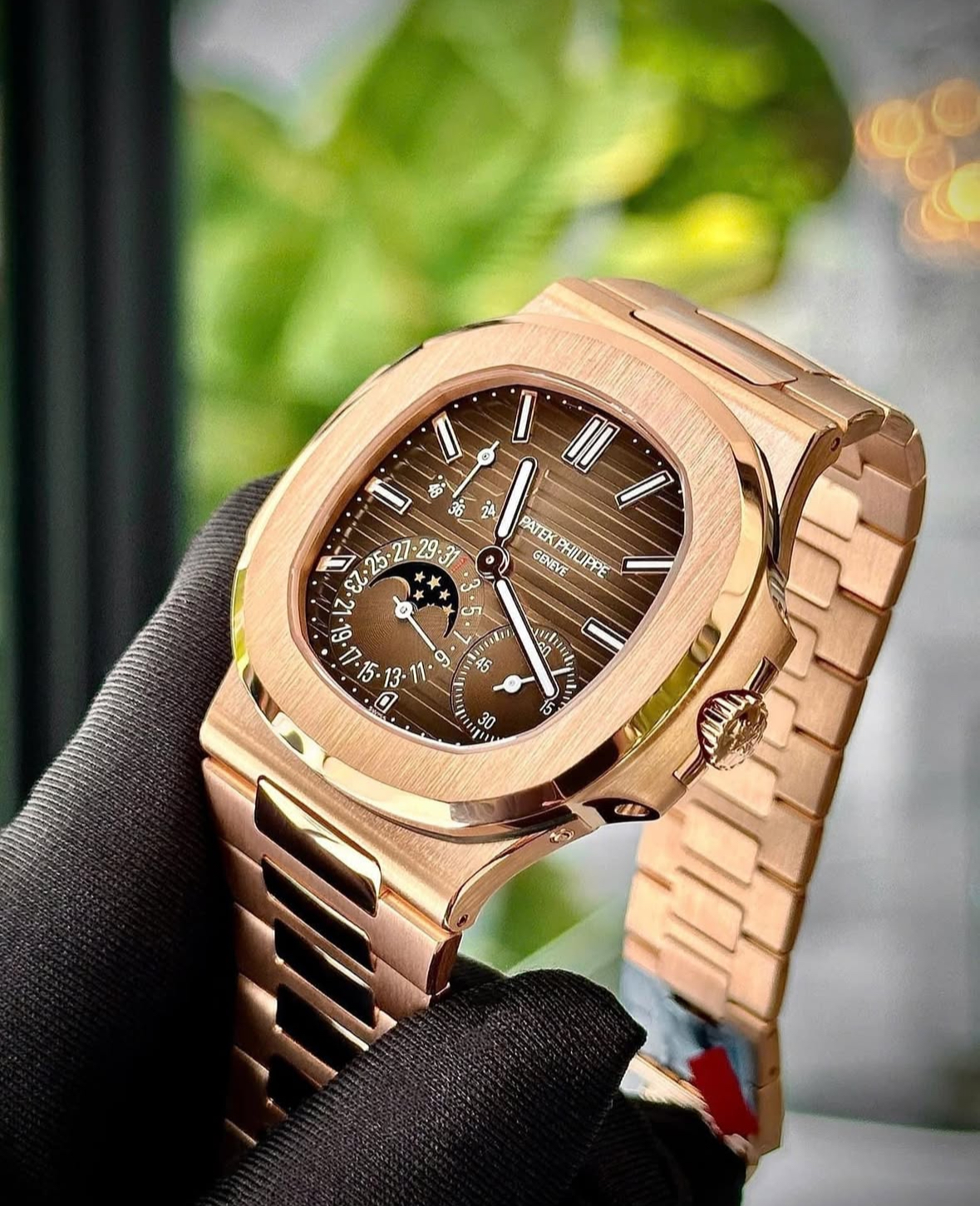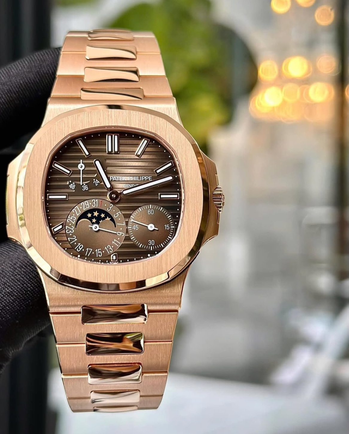 表盘材质:棕色日辉纹表盘,边缘呈黑色渐变效果,水平横纹浮雕图案,覆荧光涂层的金质立体时标、金质时针和分针,覆荧光涂层玫瑰金巴顿式圆头指针