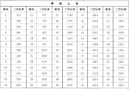 二、薪级工资薪级工资主要体现工作人员的工作表现和资历。对专业技术人员和管理人员设置65个薪级;对工人设置40个薪级,每个薪级对应一个工资标准。