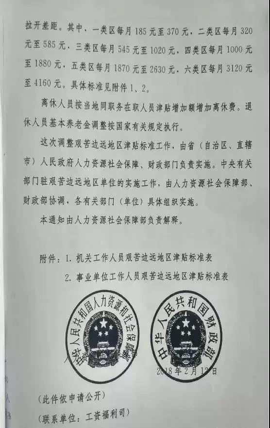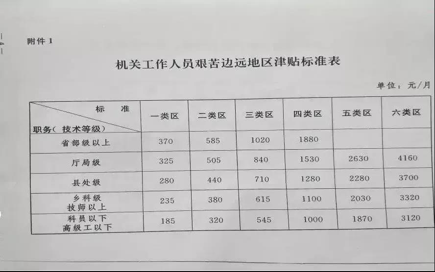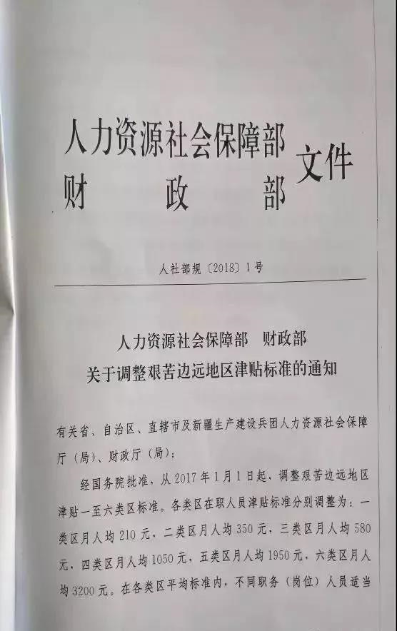 人社部、财政部在2018年初联合印发《关于调整艰苦边远地区津贴标准的通知》,从2017年1月1日起(这里指的是执行从此时间点开始补发),调整艰苦边远地区津贴一至六类区标准,六类区每月最高4160元!符合条件的地区全国共984个。目前,一些省已经开始执行!